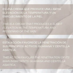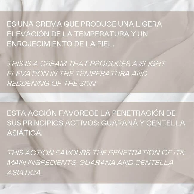 Es una crema que produce una ligera elevación de la temperatura y un enrojecimiento de la piel. Esta acción favorece la penetración de sus principios activos: Guaraná (conocido por sus propiedades tonificantes y adelgazantes) y Centella Asiática (estimula la síntesis del colágeno).