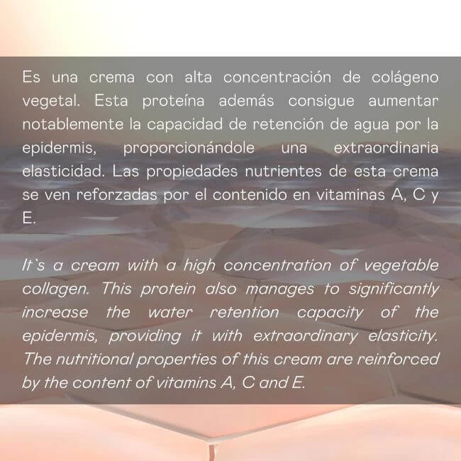 Es una crema con alta concentración de colágeno vegetal. Esta proteína además consigue aumentar notablemente la capacidad de retención de agua por la epidermis, proporcionándole una extraordinaria elasticidad. Las propiedades nutrientes de esta crema se ven reforzadas por el contenido en vitaminas A, C y E.