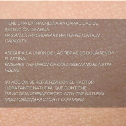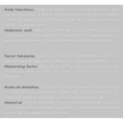 Además, hidrata las capas más superficiales de la piel, proporcionando una hidratación a largo plazo. Su acción se refuerza con el factor hidratante natural que contiene – reproducción del que posee la piel- que regula la capacidad de retención hídrica de la epidermis. Contiene además, Aceite de almendras eco, que tanto por sus ácidos grasos Omega 3 y Omega 6, como por sus propiedades vitamínicas y antioxidantes, es un hidratante perfecto para la piel y beneficioso para las arrugas. Y cuenta con certificación Halal.