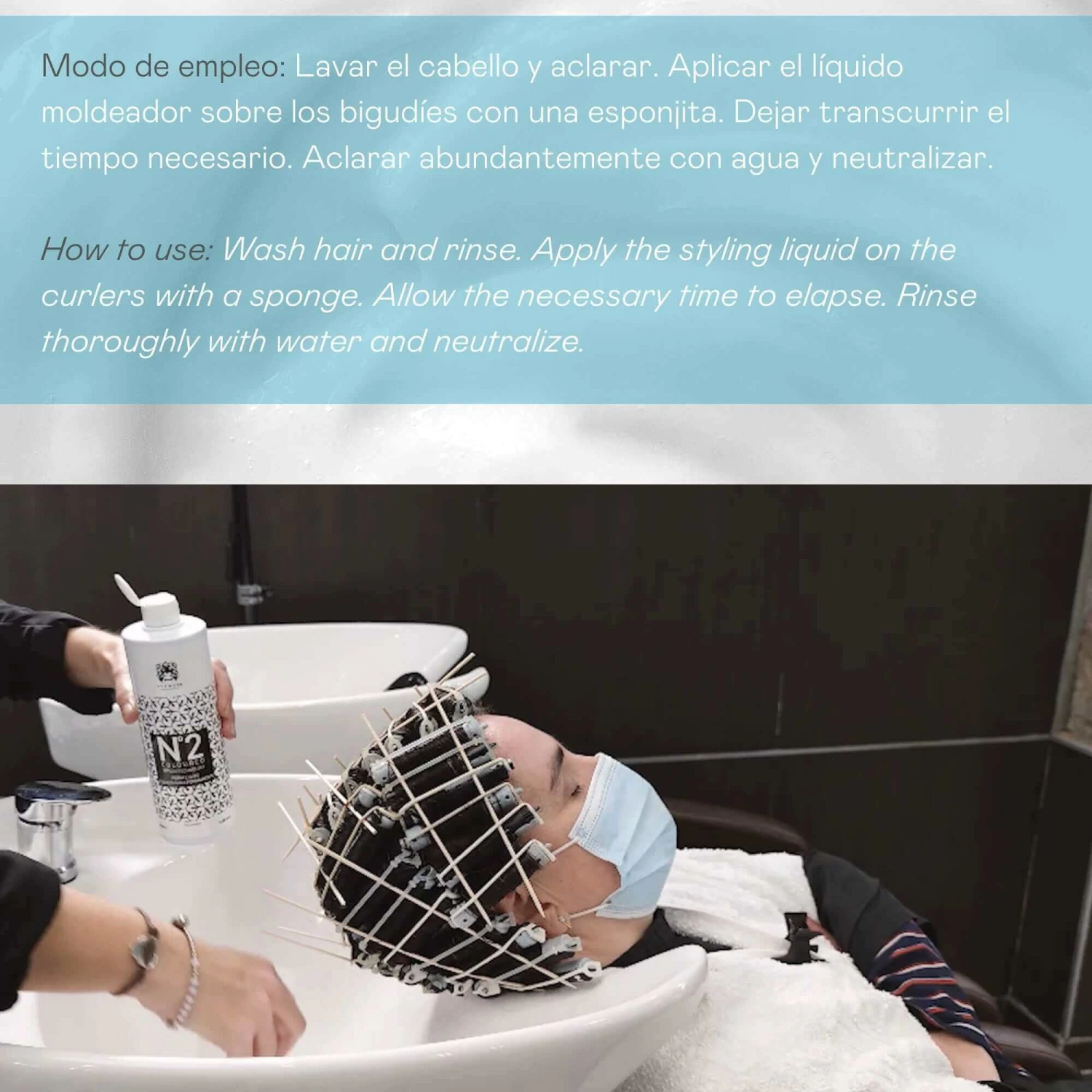 Cosmético para uso profesional en peluquerías que neutraliza el efecto del líquido de permanente sobre el cabello y recompone la estructura de la fibra capilar después de su acción moldeadora. Es un producto vegano