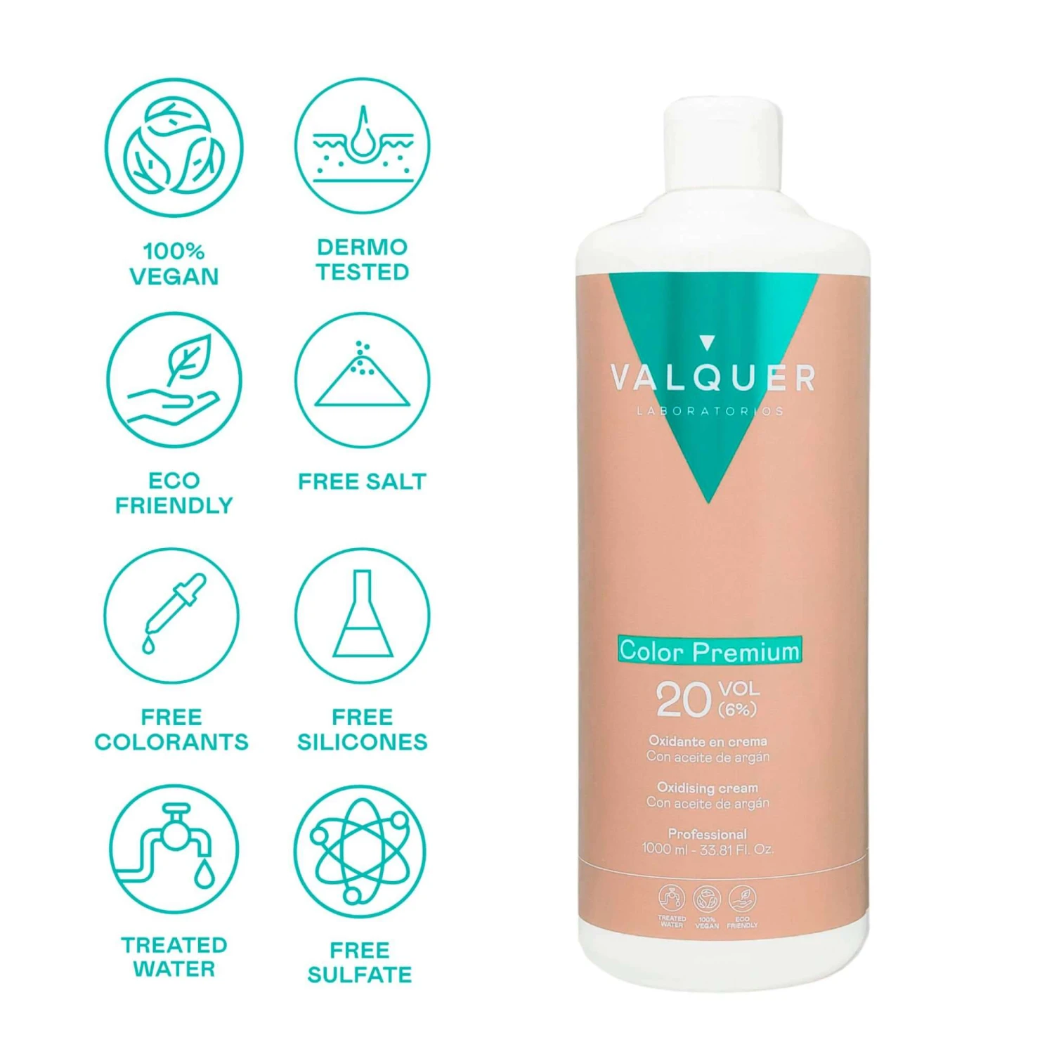 Desde Válquer Laboratorios os presentamos esta nueva emulsión oxidante perfumada que desarrolla y potencia el color, al mezclarse con la crema colorante en las coloraciones permanentes. Con una formulación vegana con agua osmotizada (desionizada) y agua oxigenada estabilizada con una riqueza de 20 volúmenes (6%), esta emulsión reduce el olor del tinte, consiguiendo un olor más agradable para el proceso de coloración del cabello. Además, gracias a su textura extra cremosa, rica en Aceite de Argán, la coloración se realiza de forma más suave y eficaz.