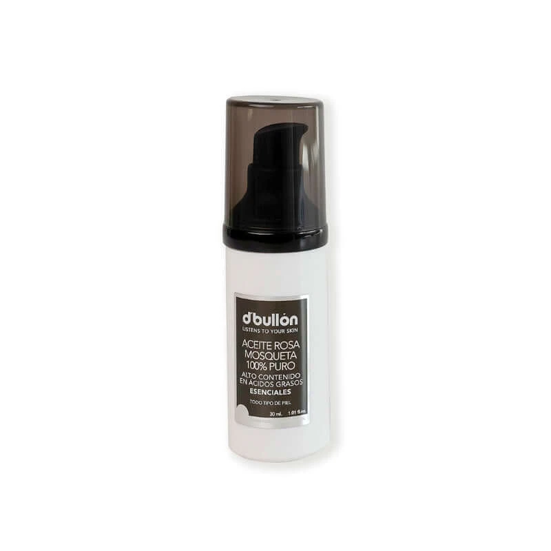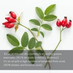 El aceite de rosa mosqueta se obtiene a partir de las semillas de los frutos de las rosáceas. Este aceite tiene un alto contenido de ácidos grasos no saturados tales como el oleico, linoleico y linolénico. Concretamente presenta un 80 % de ácido linoleico y linolénico. Debido a la presencia de estos ácidos esenciales y a su alta concentración en el aceite, hace que este producto tenga propiedades cosméticas que favorecen la regeneración cutánea, la restauración de los tejidos dañados y un extra de hidratación sobre la piel por ser un aceite vegetal. De esta forma, con su uso diario, se consigue atenuar las arrugas y las pequeñas cicatrices. Además es vegano y cuenta con la certificación Halal.