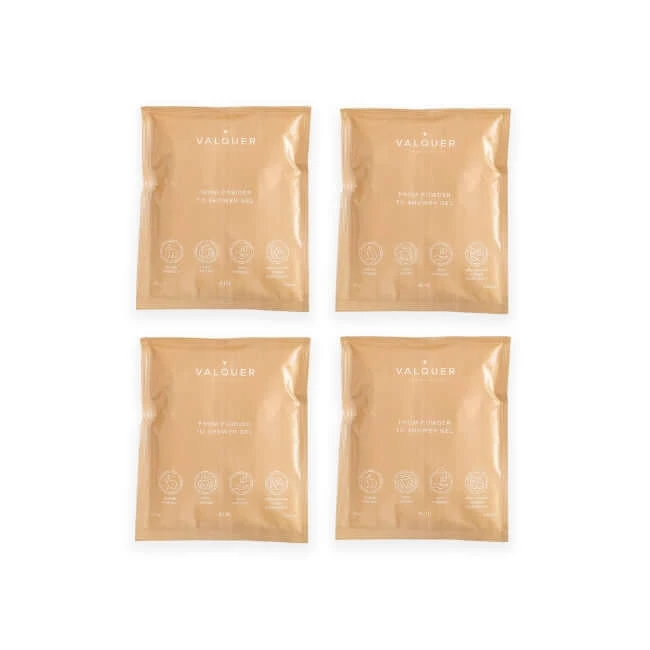 Pack de sobres de 25 gr con la fragancia Aire que se convertirán en geles de 400 ml de gel de baño sostenible y natural.