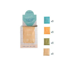 Pack compuesto por sobres de 25 gr con diferentes fragancias (Tierra, Agua, Aire y Fuego) que se convertirán en geles de 400 ml de Valquer Shake, el gel de baño más sostenible del Mundo.