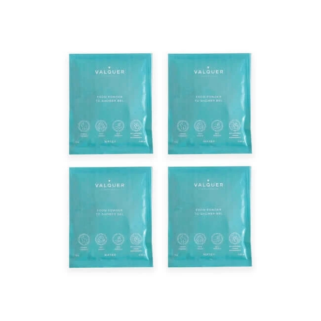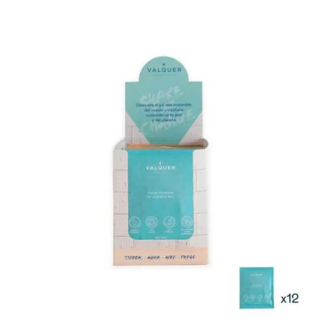 Pack de sobres de 25 gr con la fragancia Agua que se convertirán en geles de 400 ml de gel de baño sostenible y natural.